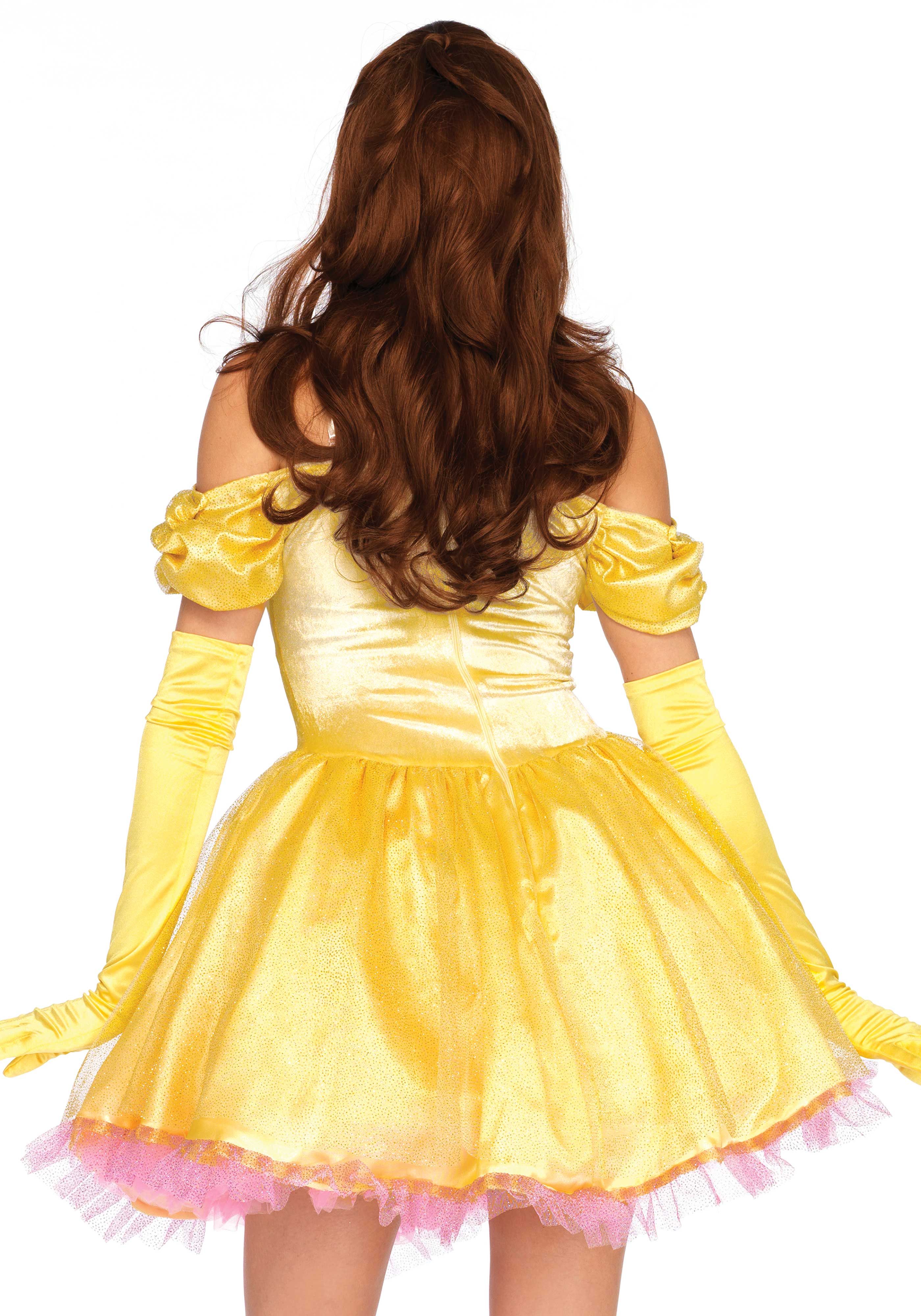 2 Piece Enchanting Princess costume, includes short ball dress with embroidered ribbon trim and rosette accents, ruched skirt of satin with a glitter tulle layer, attached clear shoulder straps and matching headband.