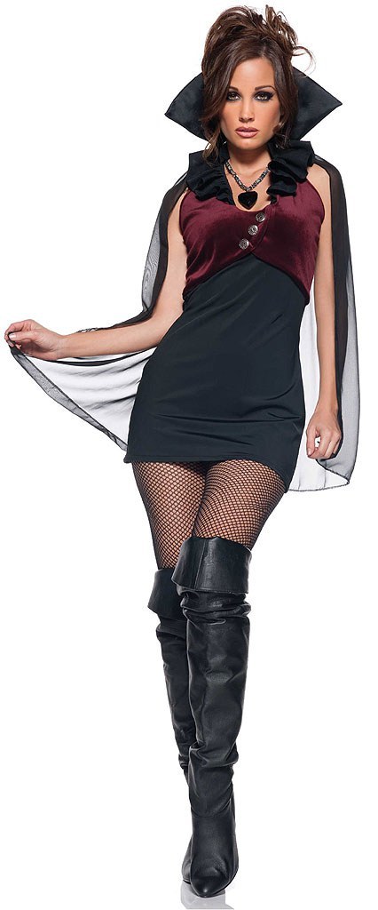 This sexy Vampire Eternity costume includes a short black dress with attached velour waistcoat with silver button detailing. Also included in this sexy costume is a black chiffon cape with stand up collar.