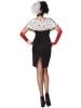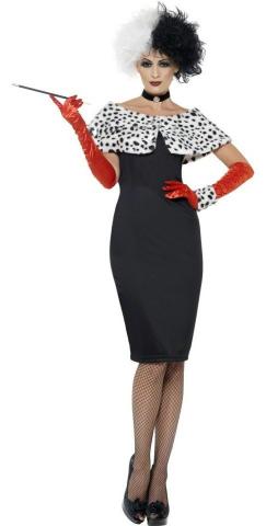 Our Evil Madame Costume is an animated dalmatian style costume, which includes a sexy black stretch dress, fake fur dalmatian print shrug, long red gloves and a choker.