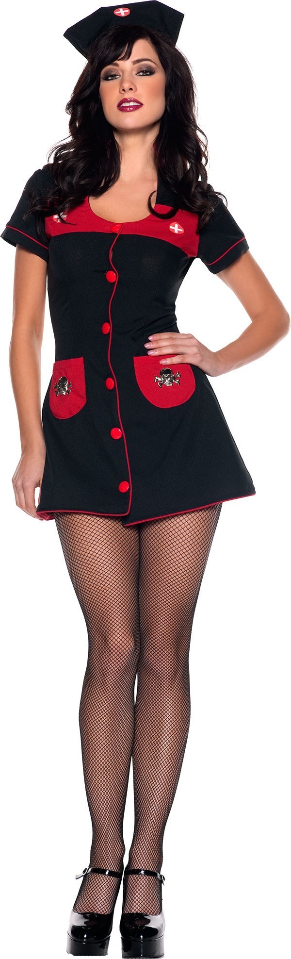 The Evil Nurse costume includes black and red one piece dress with cross motif on the chest and skull and crossbone motifs on the pockets. To complete the look a matching hat with cross motif is also included