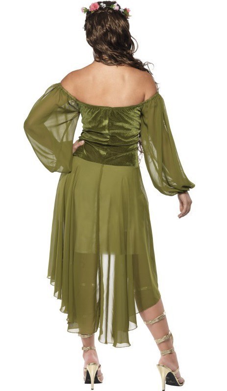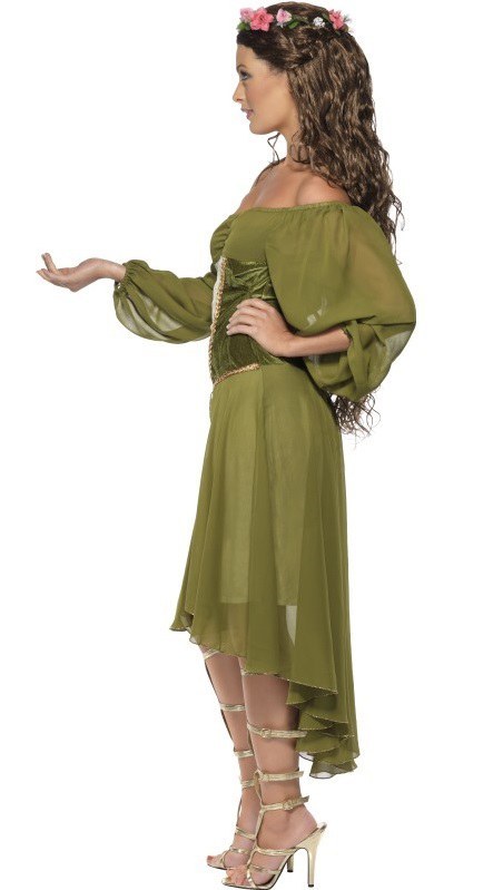 Fair Maiden Costume includes an off the shoulder dress with sheer sleeves and a layered skirt. To complete the look a hair wreath is also included.
