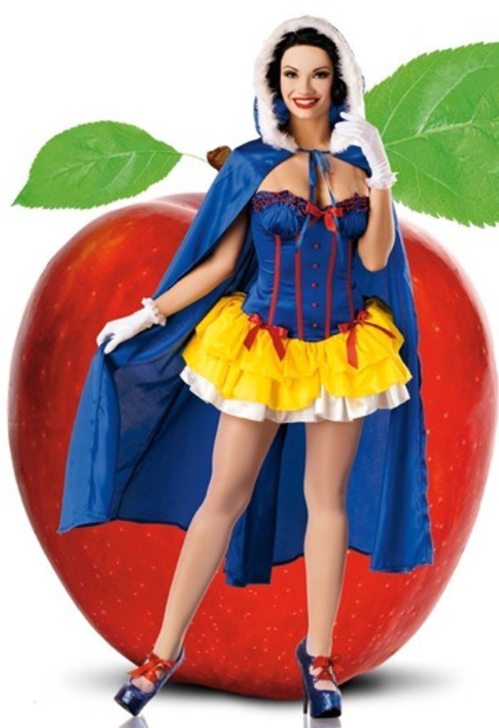 The costume features a blue corset top with red bones and red buttons. The attached skirt is yellow with white underskirt.