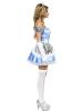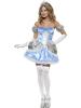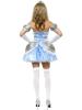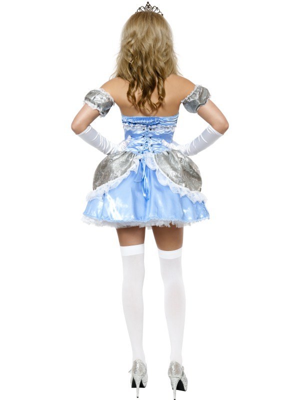 This sexy and seductress Fairytale Princess costume includes a blue satin feel dress with mock corset and attached silver peplums. The dress also features a a lace trim and a pair of clear bra straps.