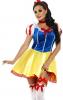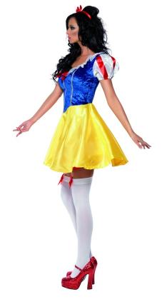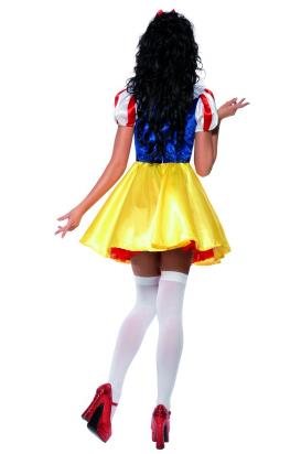 Fairytale Snow White Costume includes a yellow, blue and red dress with silver detailing and white lacy collar, a red ribbon headband, matching garter and choker.