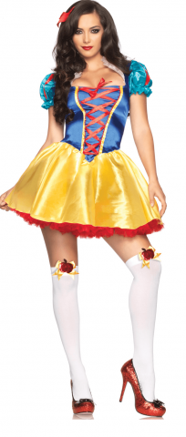Fairytale Snow White Costume includes a yellow, blue and red dress with red ribbon corset detailing up the front and a silver detailing collar.