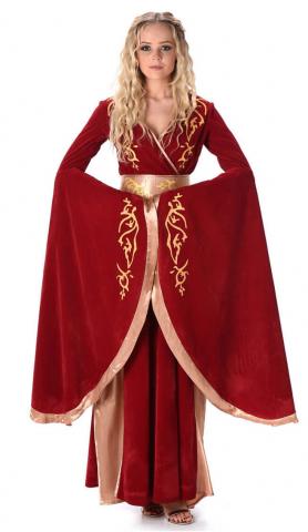 Inspired by the popular series Game of Thrones character Cersei Lannister our Fantasy Queen costume includes along red and gold elegant dress with long flowing sleeves. The dress also features a gold belt.