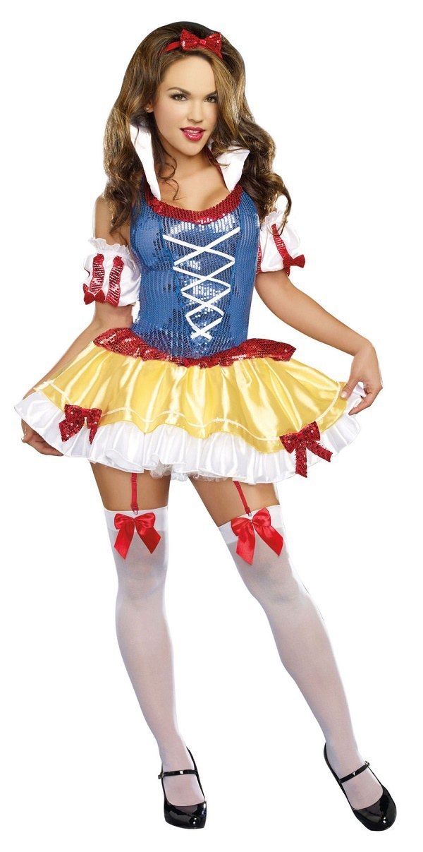 Feisty In The Forest Costume includes a halter dress with collar and sequin top. The dress also features removable/adjustable garters. Also included is a pair of puff sleeves and a sequin bow headband.