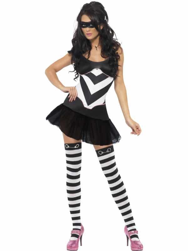 Also featured on the dress is an oversized pink bow and zip closure on the back of the dress. To complete the look a black eye mask with elastic band to hold the mask securely onto your face is also included.