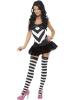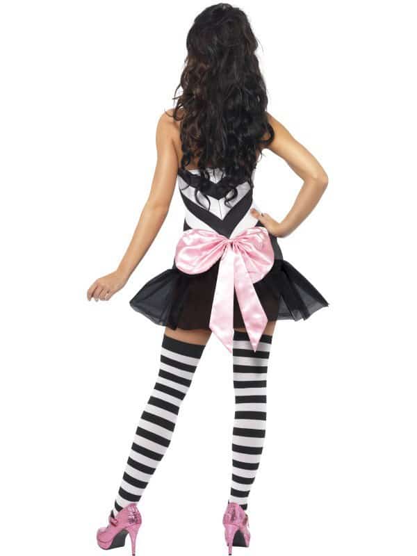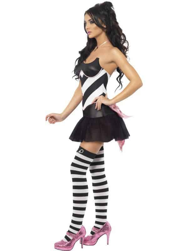 Fever Asking For Trouble Costume consists of a short black and white dress with clear straps. The dress features a black and white corset style top with pink trim and a black satin feel skirt with tulle layering.