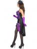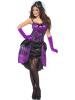 Fever Burlesque Lolita Darling Costume includes a short purple and black dress with black ribbon bows on the striped bodice and layered skirt and bustle.