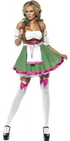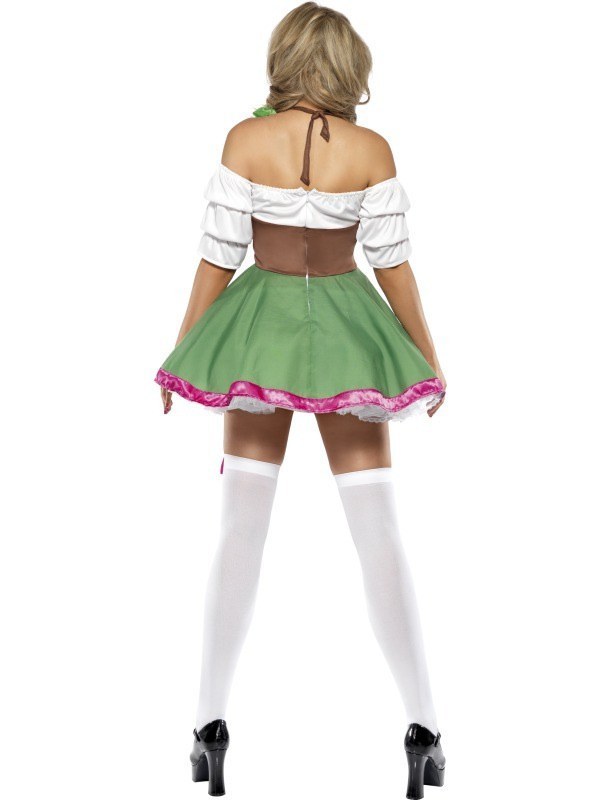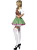 The Fever Flirty Fraulein Costume includes a short dress with an attached white apron. The dress is in vibrant colours. The lower part of the dress is green in colour with pink around the hem area. The blouse of the dress is white and brown in colour.