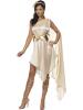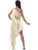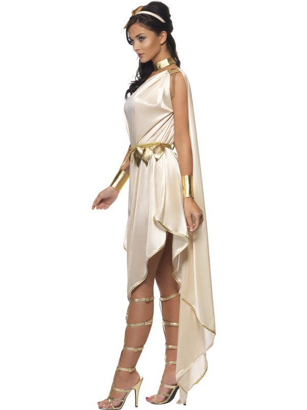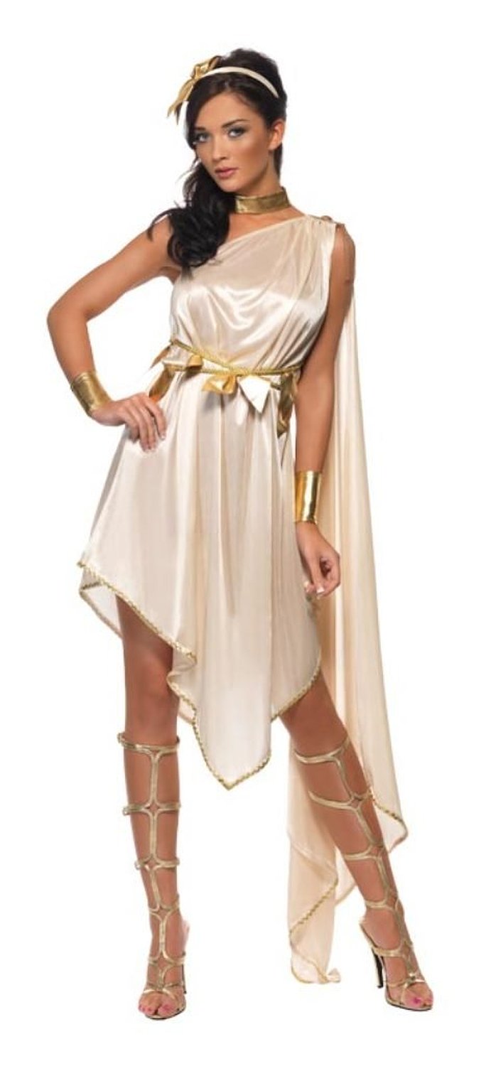 This Fever Goddess Costume is sleek and sexy with a pearly white satin-look dress, golden belt and a pair of golden arm cuffs. Also included in this elegant costume is a golden choker and a golden and white headpiece.