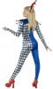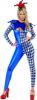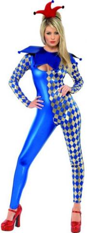 Fever Harlequeen Harlot includes a shiny blue and gold print jumpsuit with zip up back, blue oversized collar with tassels and a red crown headpiece to finish off the look.