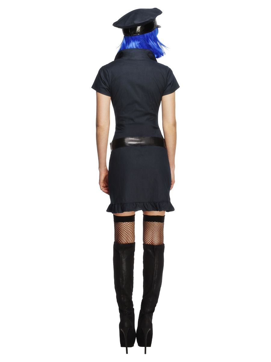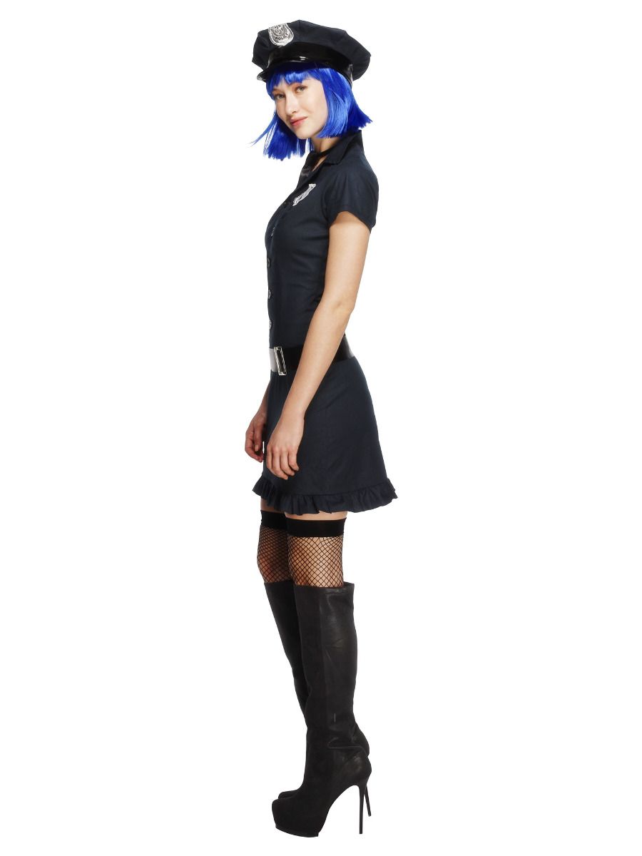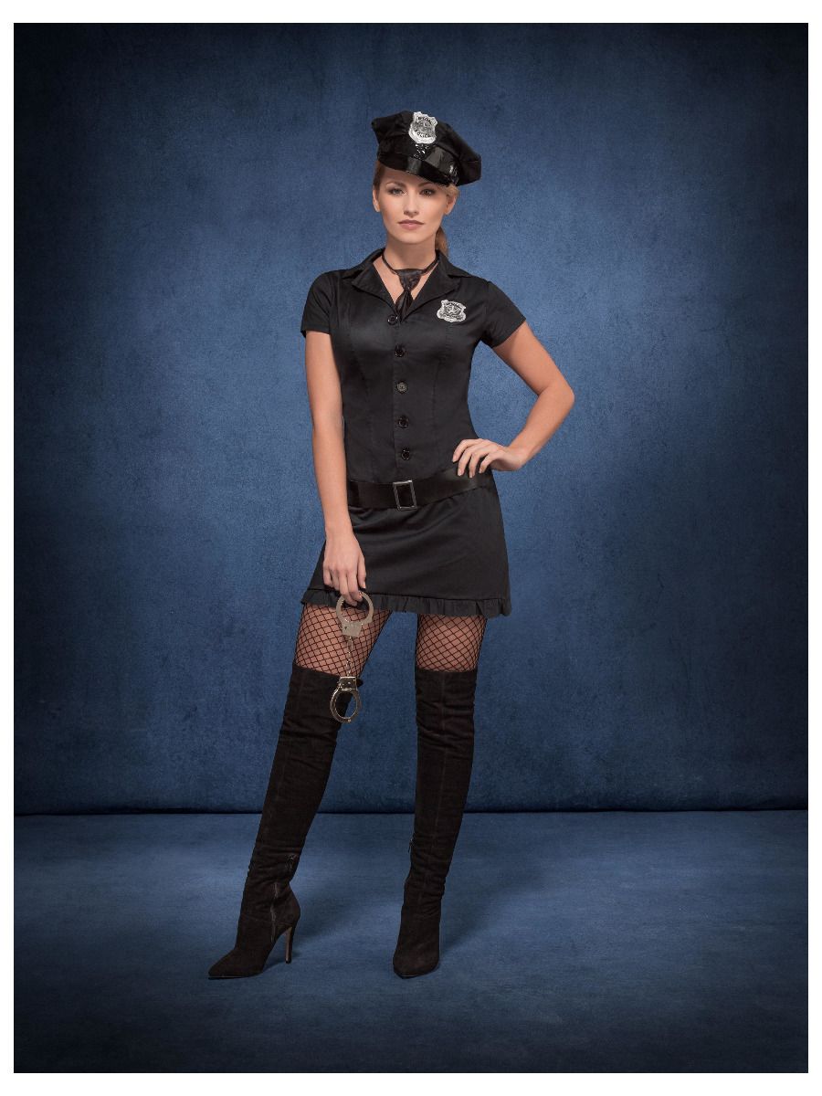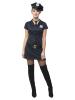 Fever Naughty Cop Costume includes a blue dress with frilled trim around the skirt, blue hat with black cap, black tie and belt.