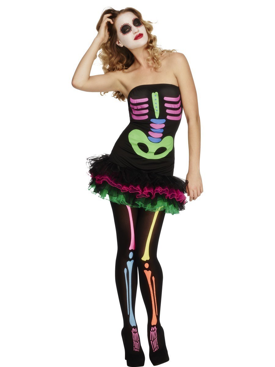 Be noticed in this bright and fun Neon Skeleton costume. The Skeleton costume features a black dress with bright neon skeleton print. The costume also includes a black layered tutu with neon colours. The top of the dress has detachable clear straps.