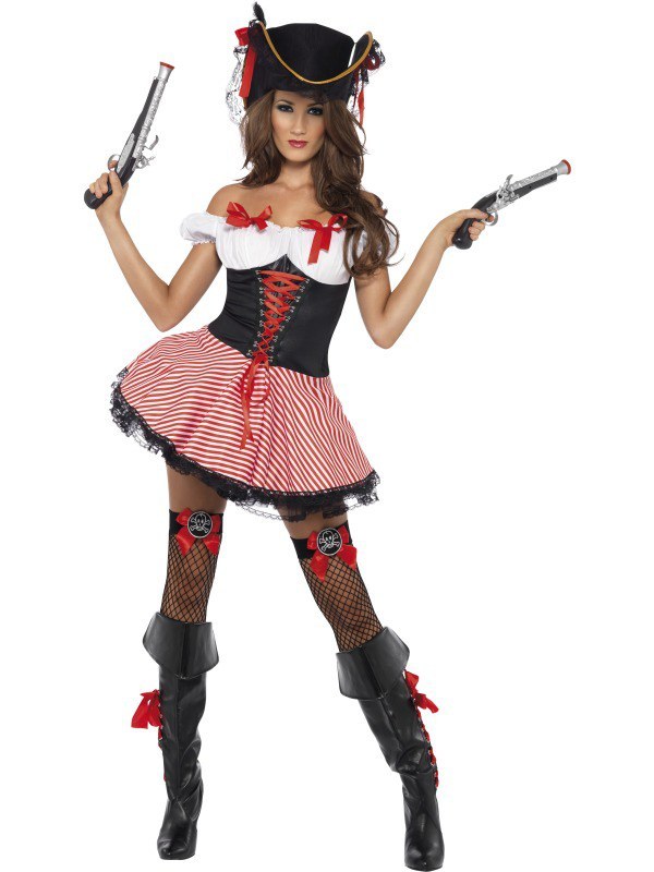 The Fever Pirate Costume is a one-piece dress with a striped bottom and lace-up corset. The corset is black and white with white off-shoulder sleeves. There is also red ribbon detailing on the corset.