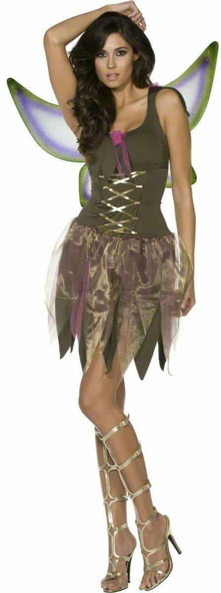 Fever Pixie Costume includes a khaki dress with gold corset tie detailing on the front, gold and purple chiffon floating along the top of the skirt part of the dress and matching wings.