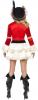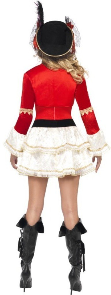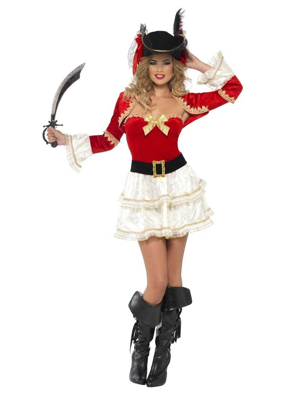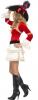 The Fever Plentiful Pirate Costume is a one-piece dress with a red velour sweetheart shape top with cream bow and cream lace edging and white layered skirt with cream lace edging detail. The short bolero jacket is also red velour with cream edging and the bottom of the sleeves are flared white lace with cream edging. To complete the look a black belt with gold buckle is also included