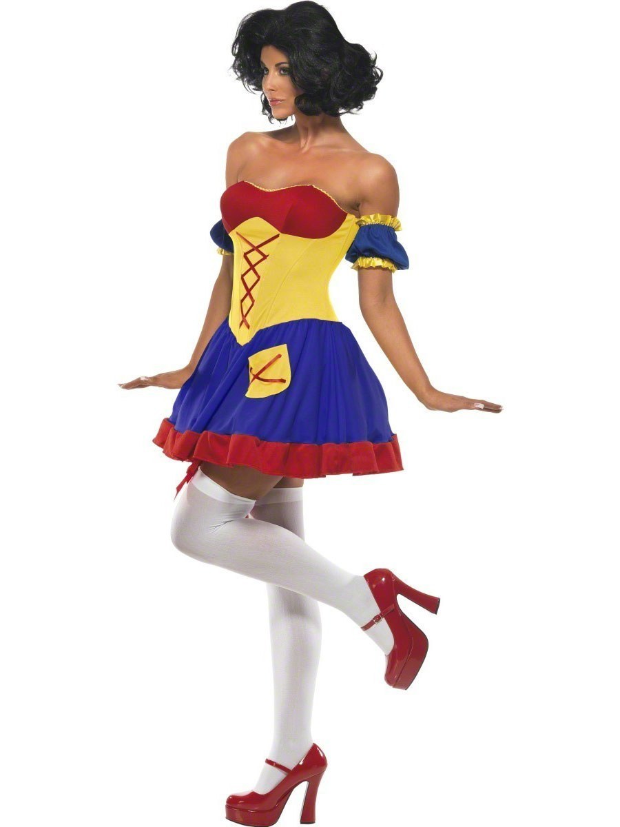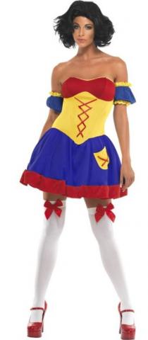 Fever Rebel Toons Snow White Costume includes a blue, yellow and red corset style dress with faux ribbon and ruffle hem. Also included are matching puff sleeves.
