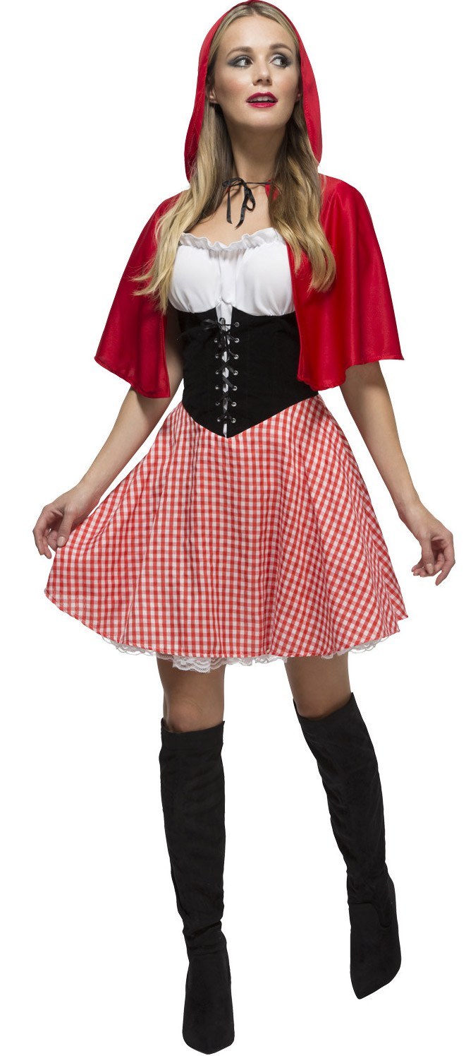 The Red Riding Hood Costume includes a short red and white gingham dress with attached black lace-up corset effect to the front.