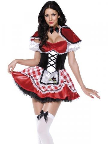 Fever Boutique Red Riding Hood Costume includes cute chequered red and white dress with white puffed sleeves it also has black and red corset top, white satin apron with black and white lace frill, red cape with bow tie.