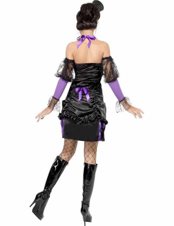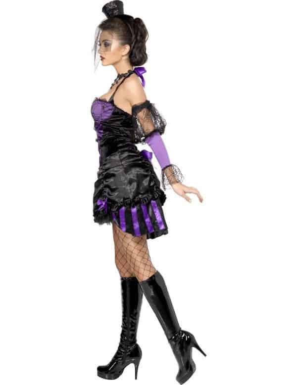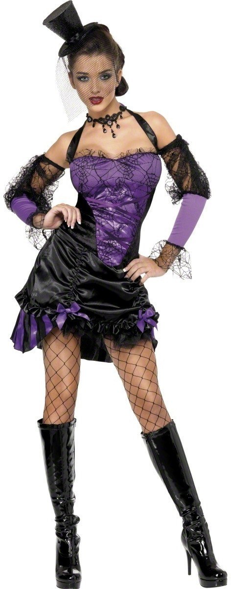 Fever Seductive Can Can Costume includes a short purple and black halterneck dress with spiderweb patterned lace detailing on the bodice and black ruffles and black bow detailing on the skirt. To complete the seductive look a pair of lace sleeves are also included.
