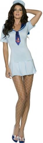 Fever Shipmate Sweetie costume consists of a baby blue pleated mini dress with attached collar and tie. To complete this sexy look a baby blue sailor hat is also included.