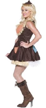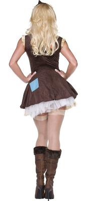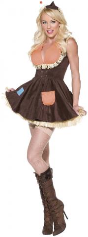 Fever Sultry Scarecrow Costume consists of a faux velour, brown dress with straw trim around the bright orange chest piece and at the end of the dress. The dress also has a bright orange pocket and two blue patchwork detail and six faux gold buttons on the front. Dress has a zip at the back to close.