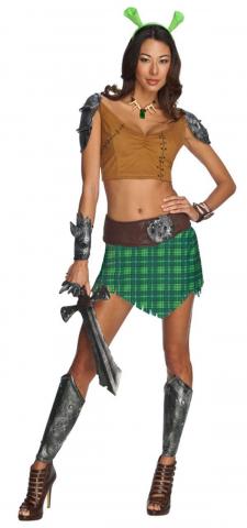 From teh. film Shrek, this licensed Fiona Warrior costume includes a brown belly top with attached armour styled shoulder guards and black ties printed on it. The skirt is green plaid tattered at the bottom with elastic waistband. Included with the costume is brown belt with latex medallion, cuff, gauntlet, knuckle piece, shin guards, and green headband with ears.
