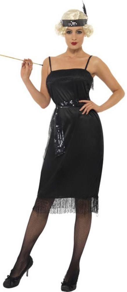 Flapper Costume includes a sexy layered fringe dress in black with with a matching sash. A matching sequin headband with is also included in the costume to finish off this stylish look.