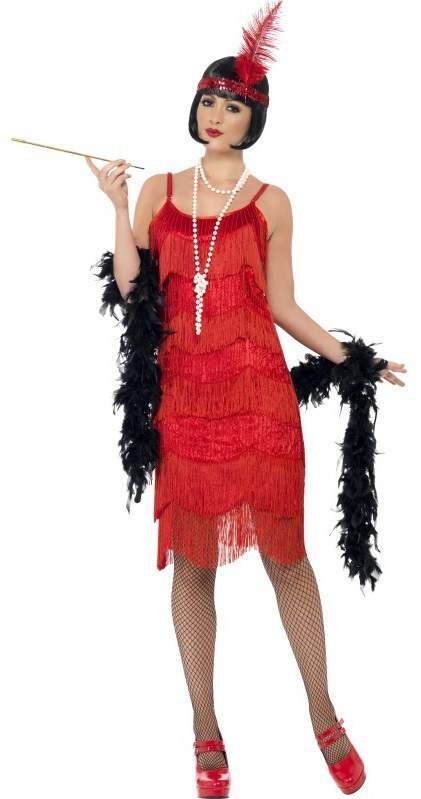 Deluxe Flapper Shimmy Costume includes a red knee length beaded dress. The dress is plain at the back. To complete the look a flapper sequin headpiece with feather is also included.