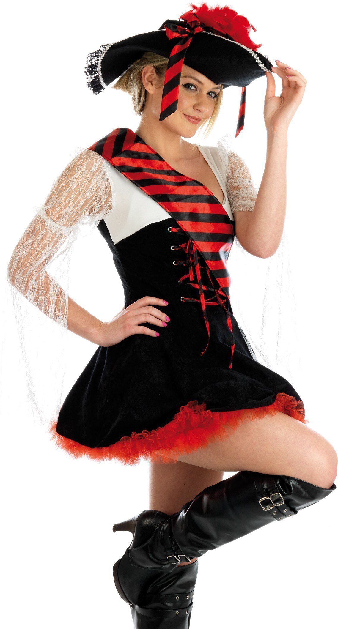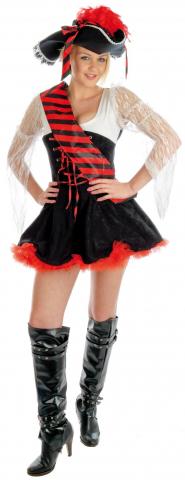 Flirt all night in this Flirty Pirate costume, this stylish costume includes black and red petticoat dress with white lace sleeves, bold red and black sash which is sure to grab attention.