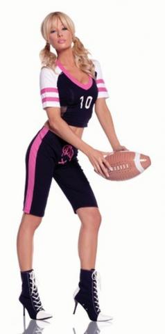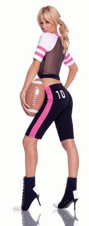 Hit a home run with our Tight End ladies costume, This sporty costume consists of a pink, white and black crop top with a v neck line and a printed number 10. Also included is a pair of black three quarter length leggings with a pink strip and pink lace closure and a number 10 printed on the back.
