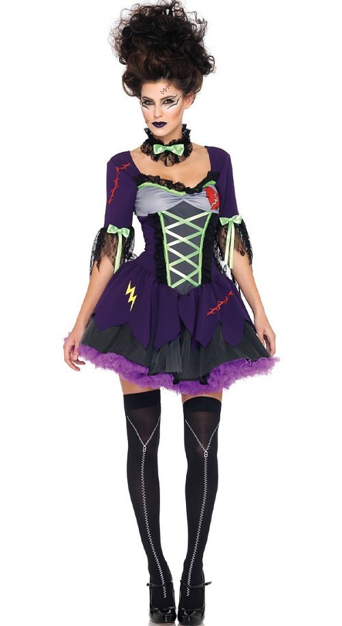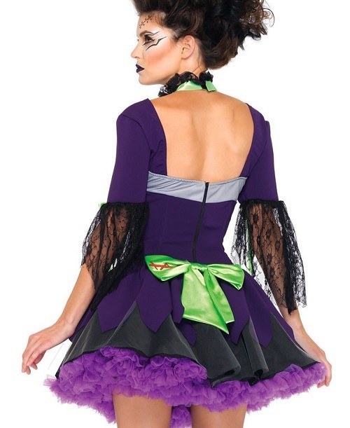 Frankie's Bride Costume includes a lace trimmed dress with tulle skirt and broken heart detail. The dress also features a removable oversized bow back and a lace ruffle neck piece with satin bow accent.