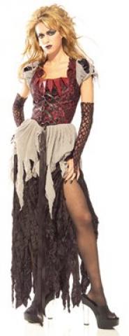 There is a lace up front and long black ribbons, also included is gauzy overlay on the puff sleeves and peplums for that ghastly look.