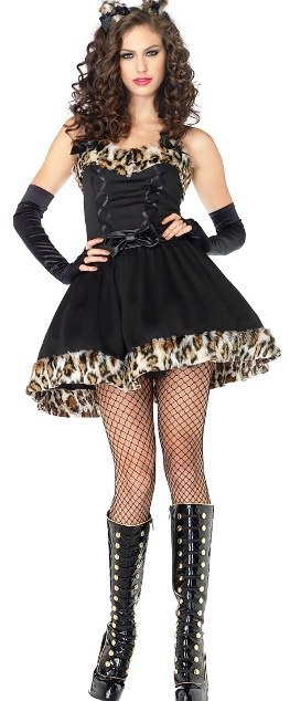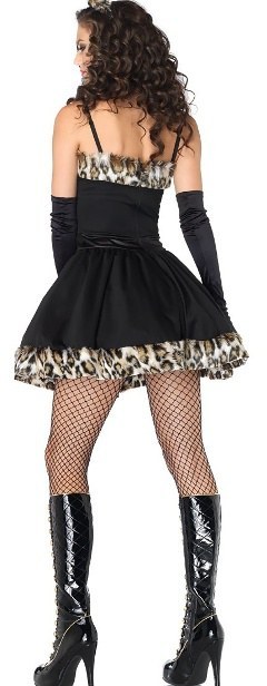 This sexy Frisky Feline costume includes a plush leopard trimmed black dress with lace up accents. Also included in this sassy look is a pair of ears on a headband.