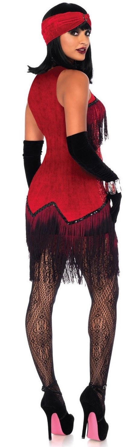 Step right into the roaring 20s in the 2 piece Gatsby Girl flapper costume. This Halloween costume features a stunning sequin flapper dress with dip dye ombre fringe, a stretch velvet back for the perfect fit, and a matching turban.
