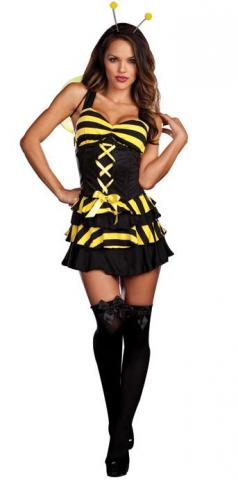 The Gettin' Busy Bee costume features a short, black and yellow ruffle hem dress with black corset style bodice with yellow ribbons and black straps.
