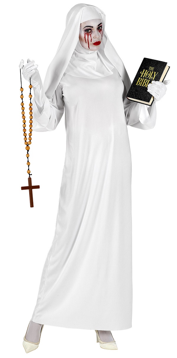 Be a creepy nun this Halloween with our Ghostly Nun Costume. Included in this costume is a long white dress and a white nun headpiece. To complete the look a pair of white gloves are also included.