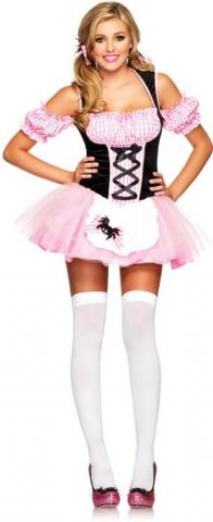 Miss Muffet costume includes a gingham pink tutu peasant style dress with front corset lace and an attached apron with spider applique. The dress also feature sleeves that can be worn on or off the shoulder.