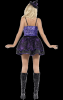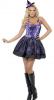 Glimmer Witch costume includes a purple and black glitter dress with sequin purple top. Also included is a black hat with purple bow.