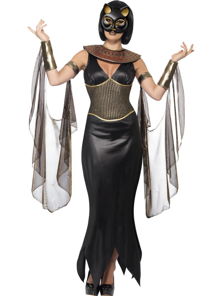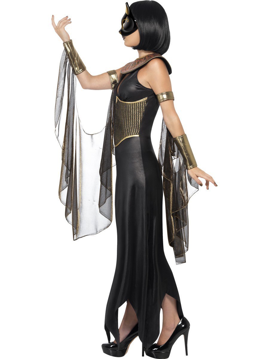 Bastet the Cat Goddess costume consists of v-neck, full length faux leather black dress with jagged hemline, the bodice of the dress features gold grid effect detailing. The dress also features elegant Egyptian collar and drape sleeves which are attached to gold arm cuffs.
