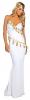 This elegant Goddess Of Sparta costume includes a long halter style white gown with ruched cup detailing and gold leaf garland. The dress is backless and features a gold strap at the back to hold the dress securely on.