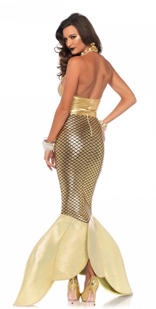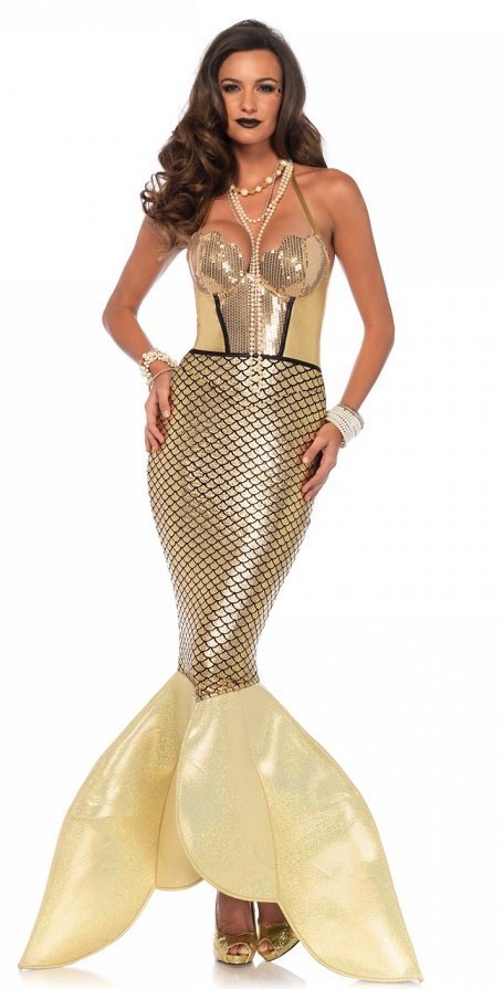 Golden Glimmer Mermaid Costume includes a halter dress with sequin underwire bodice and shimmer foil scale print skirt with foam fin tail.