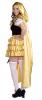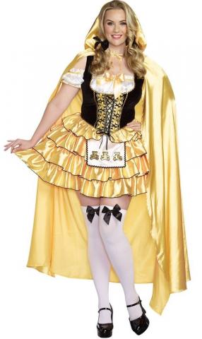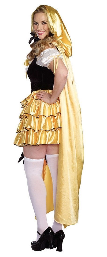 Goldilocks Costume includes a velour and satin dress with a layered skirt, attached mini apron with bear print and lace and ribbon detail. To complete the look a long hooded satin cape is also included.