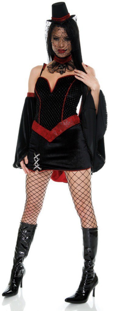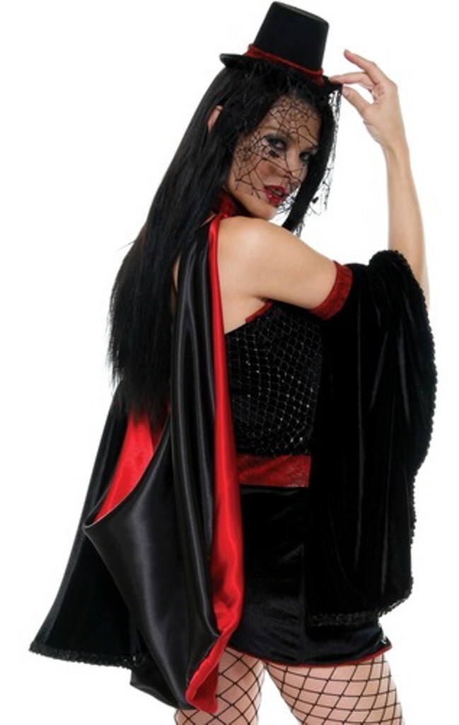 Gothic Glam costume includes a sexy red and black strapped dress with belled sleeves and a lace choker. Also included in this Goth costume is a black top hat with red trim and attached spider web veil.