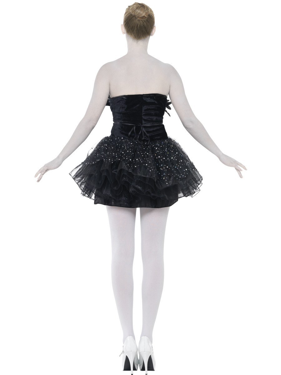 The Gothic Swan Costume includes a black layered tutu dress with feather and sequin detailing on the bodice and matching sequin detailing on the tutu.