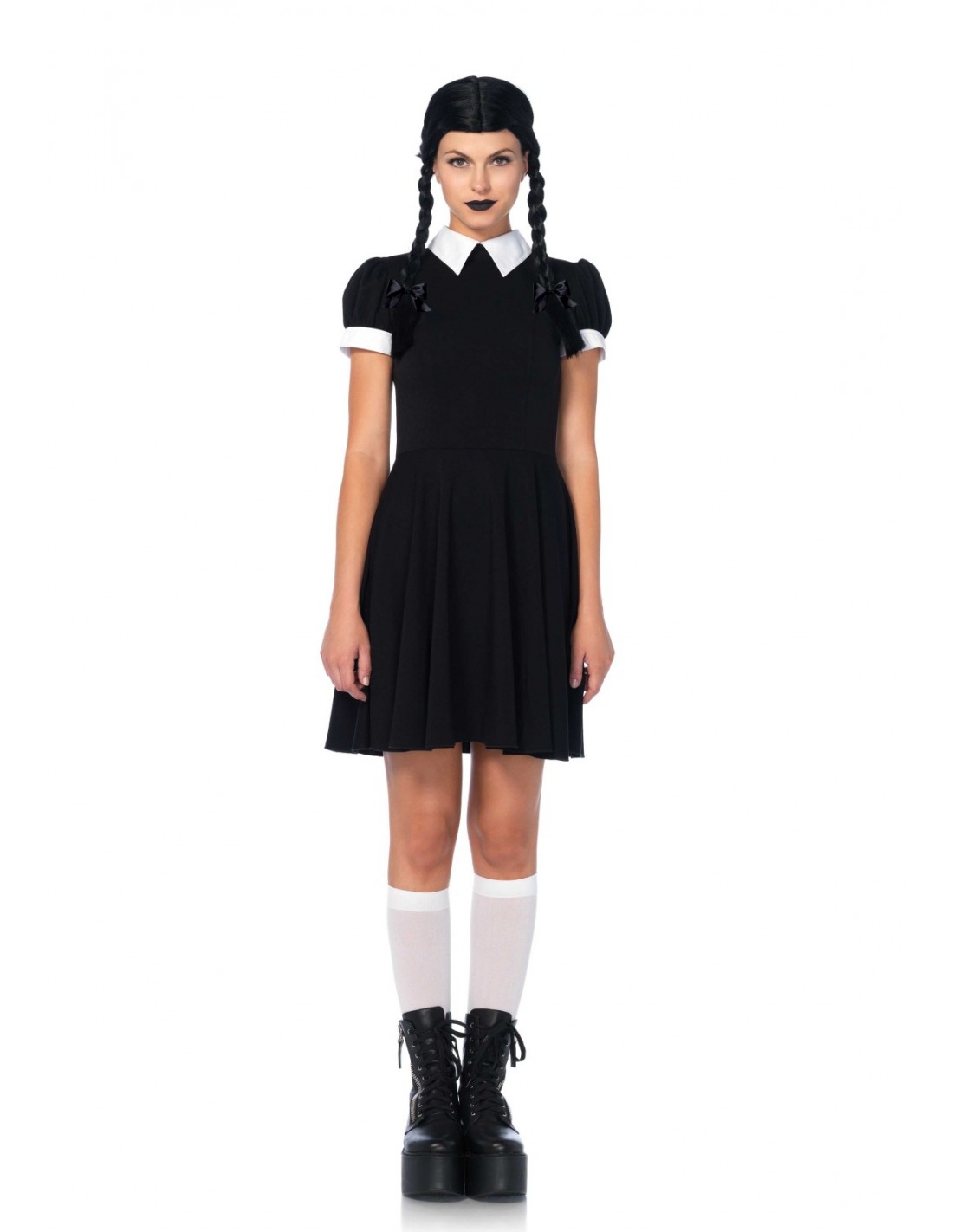 Creepy and kooky, this Gothic Darling Costume is all Wednesday vibes. The 2 piece costume includes the classic collared dress and a matching braided wig with satin hair bows. You can't go wrong with this spooky cute Halloween costume for women!
