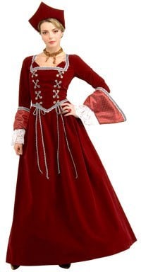 Grand Heritage Faire Maiden Costume is a very elegant costume of very high quality. The costume consists of a long, wine, faux velour long sleeved dress with fantastic silver stitch and white lace design on the chest.