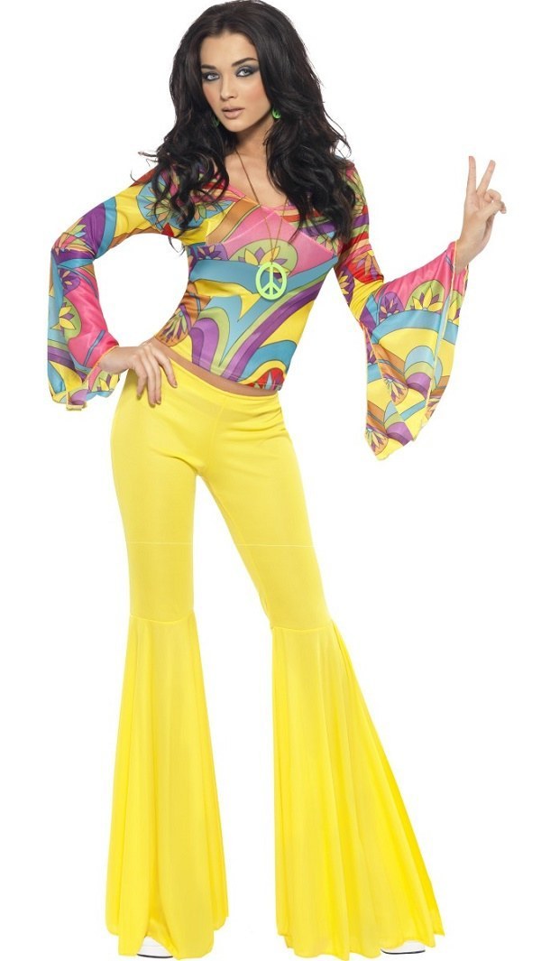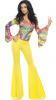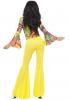 70's Groovy Babe costume includes a colourful top with bell bottom sleeves and a pair of yellow flared trousers.
